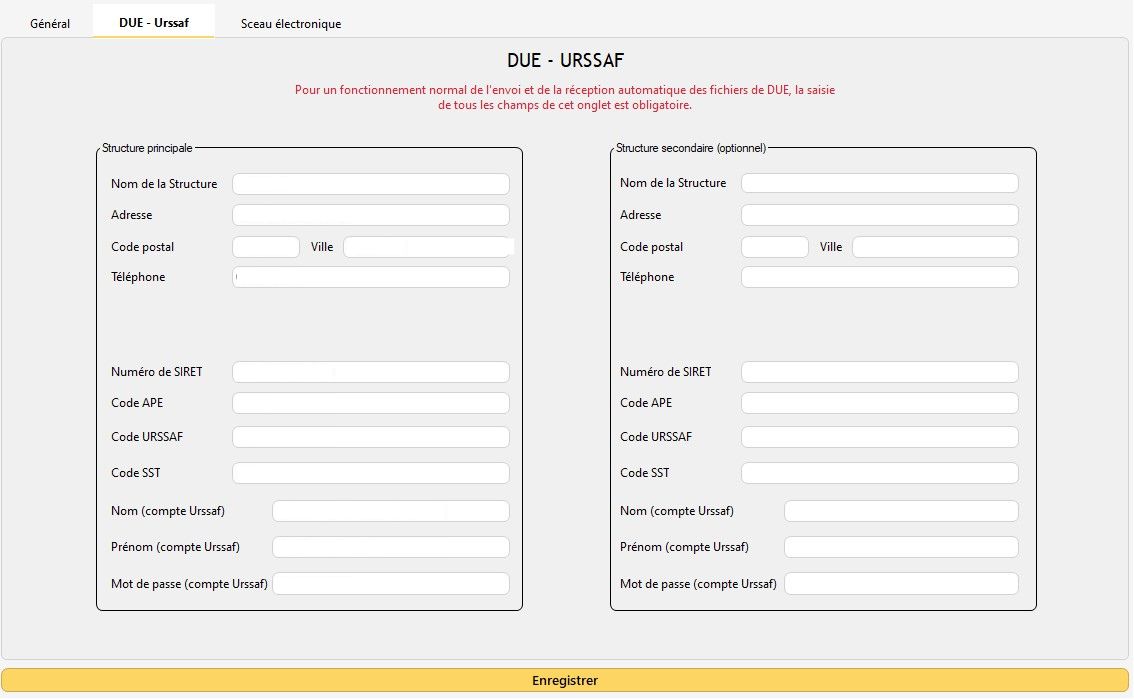 Avant la déclaration de DUE et l'édition de contrats de travail en mode automatique, l'utilisateur doit s'assurer que certaines informations sont bien renseignées de Menu déroulant "Structure" puis "Informations sur la Structure...", dans l'onglet "DUE - URSAFF". Une fois les informations renseignées, cliquez sur le bouton "Enregistrer"