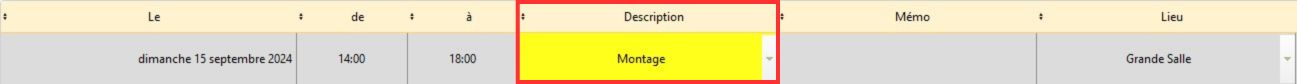 Une fois que vous avez paramétré le mémo lié avec la description, vous pouvez aller dans l'éditeur de planning de votre fiche spectacle ou activité pour créer la ligne de planning avec la description en question. Le mémo s'intégrera automatiquement à votre ligne de planning. Pour suivre cette procédure, suivez l'article Saisie automatique du mémo suivant une description