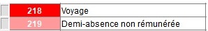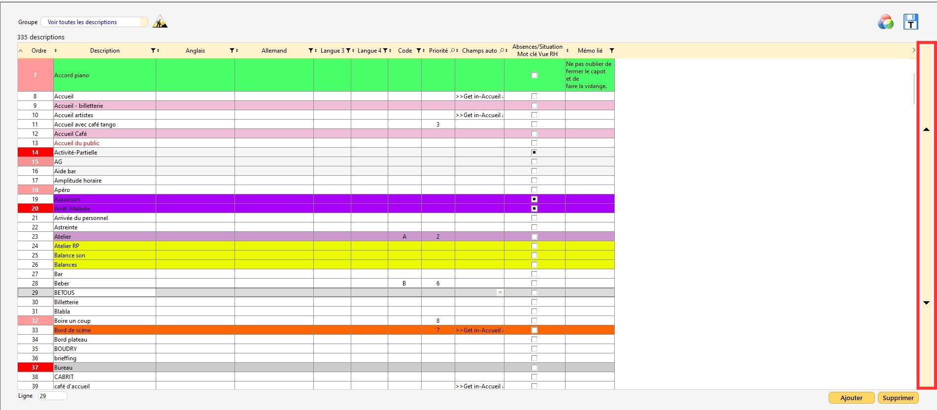 Des descriptions spécifiques au personnel grille-cadres peuvent être rajoutées. Ici elles se distinguent par la couleur rouge pâle sur le numéro d'ordre (le rouge foncé correspond aux descriptions mots-clefs, voir le chapitre "Descriptions mots-clefs").