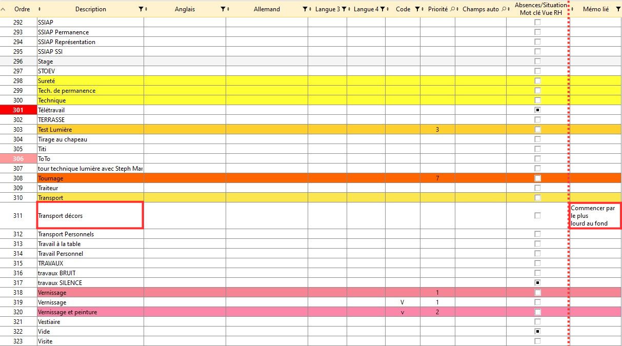 correspondent au travail à réaliser (passé, présent ou futur) dans les lignes de planning. Elles apparaissent dans un menu déroulant utilisé dans les éditeurs des plannings du logiciel.