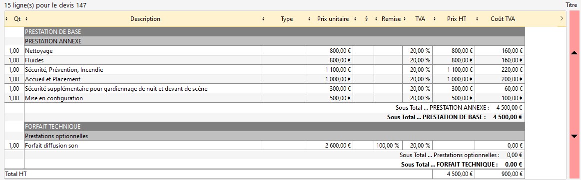 Info : Pour chaque titre et/ou sous-titre créé, apparaît une ligne de sous-total.