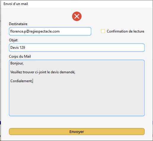 Le devis est inséré en pièce jointe. L'adresse mail du destinataire se remplit automatiquement selon le client renseigné lors de la création du devis (le champ mail devra être renseigné en amont depuis la fiche du client). Pour permettre l'envoi du mail, RégieSpectacle devra été paramétré avec votre boîte mail. Le mail envoyé apparaîtra dans la boîte "Éléments envoyés" de votre boîte mail. Une option de confirmation de lecture est possible.