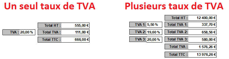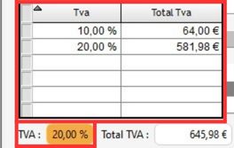 Il est possible d'appliquer des taux de TVA différents d'une ligne à l'autre et suivre les sommes des montants de chaque taux.