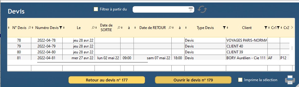 Info : si la coche "Filtrer à partir du" n'est pas cochée, la totalité des devis apparaîtra dans la table.