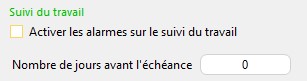 La case "Activer les alarmes sur le suivi du travail" permet aussi de lancer les tests sur échéances de tous les Suivis. Ce test est effectué à l'ouverture du logiciel.