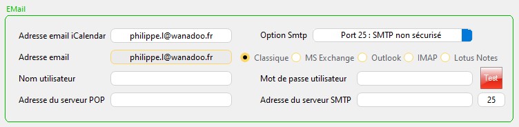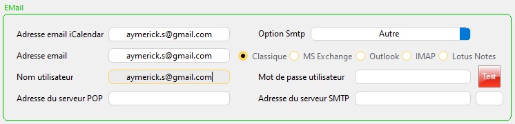 2/ Renseignez votre adresse Gmail sur les champs "Adresse email iCalendar", "Adresse email" et "Nom d'utilisateur".