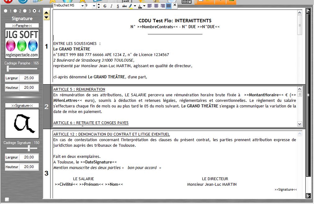 L'éditeur de modèles de contrats permet de gérer plusieurs pages, voire y inclure paraphe et signature.