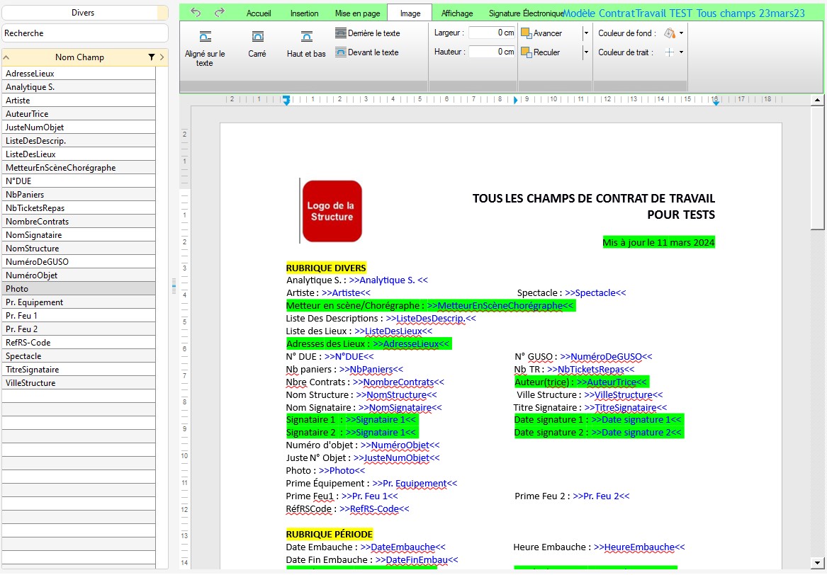 Placer les emplacements signature sur le modèle de contrat de travail :
