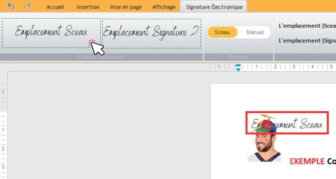 3/ Cliquez sur le rectangle "Emplacement Sceau" ou "Emplacement Signature 1" ou "Emplacement Signature 2" pour intégrer l'emplacement signature que vous souhaitez sur votre page.