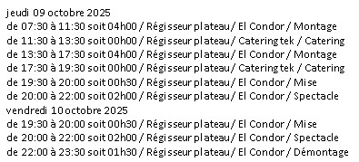 vient récupérer toutes les informations de planification du personnel, informations liées au contrat : date ; horaires ; durée des lignes ; qualification ; nom du spectacle ; description.