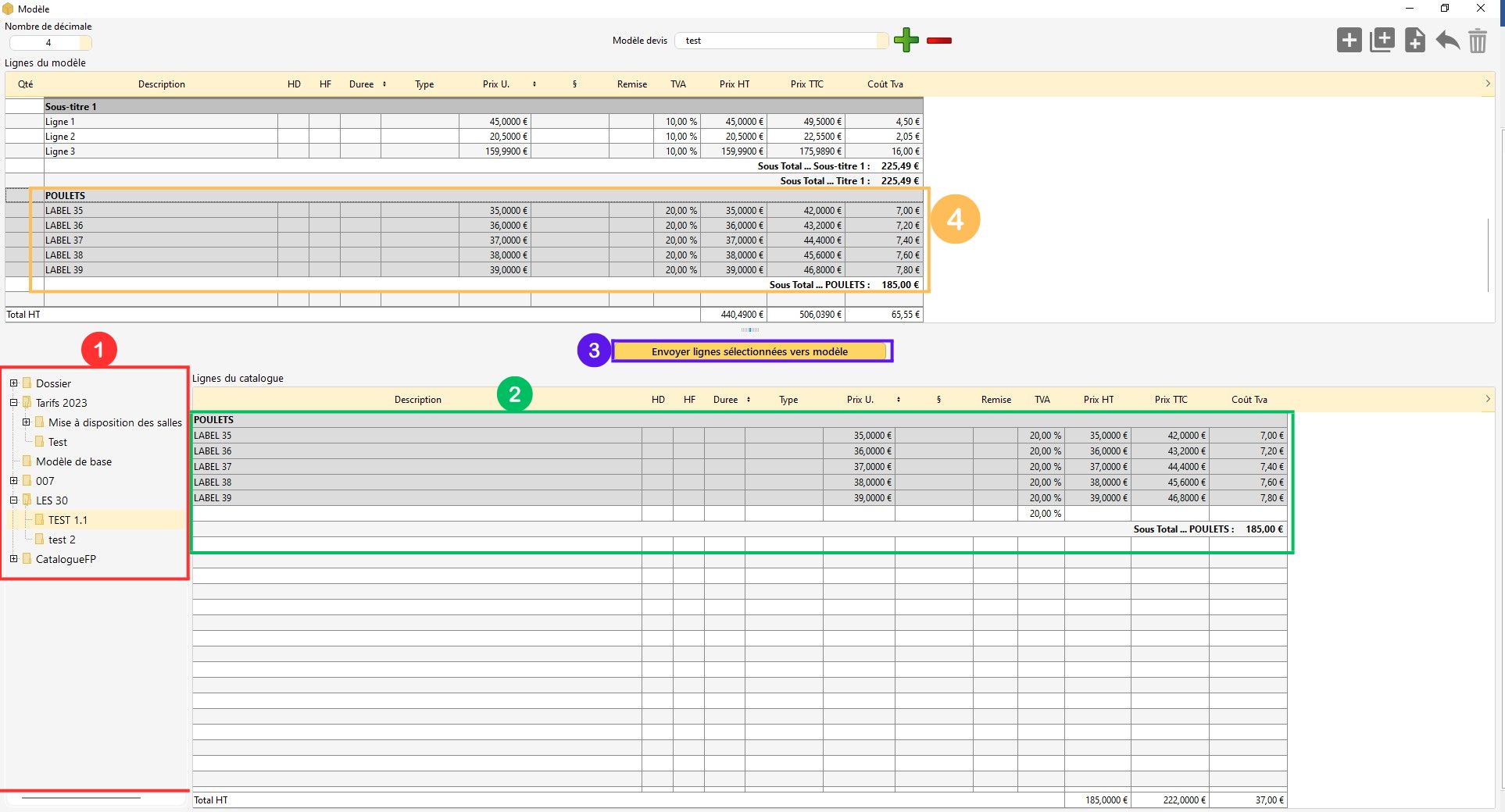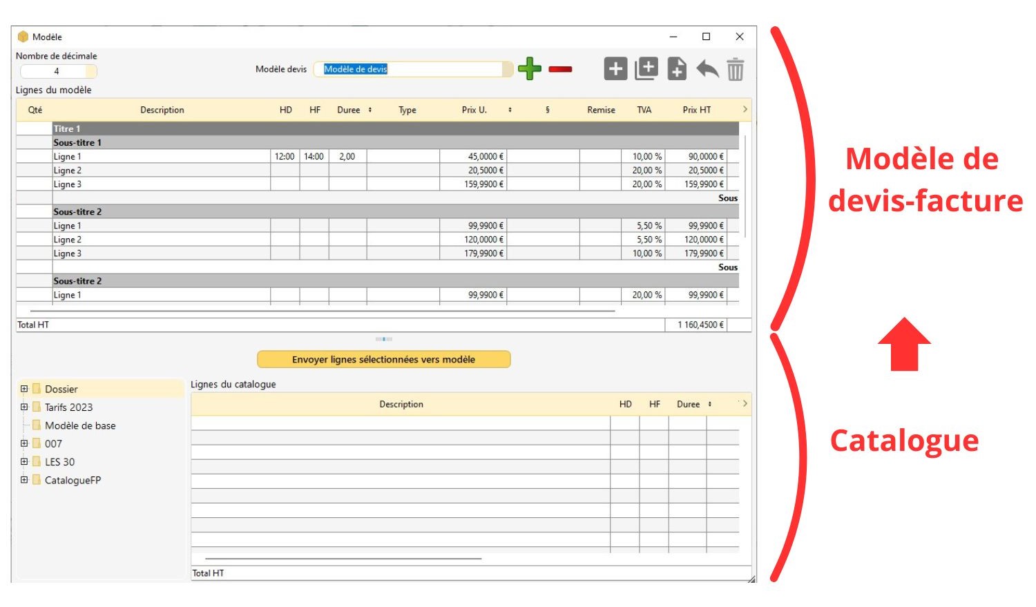 2/ la partie inférieure traite du Catalogue de votre structure. De fait, si vous le souhaitez il est possible de personnaliser un modèle de devis-facture en s'inspirant des lignes du Catalogue. Pour les envoyer vers le modèle, cliquez sur le bouton central.