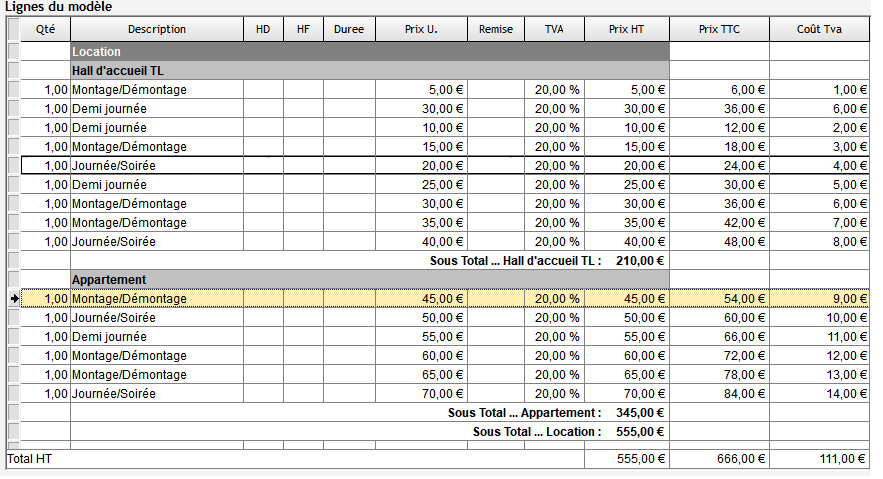 La table du modèle calcule automatiquement la somme de chaque titre et sous-titre, le total HT, TVA et TTC. Par la suite, toutes les informations de vos lignes seront modifiables lors de la rédaction du devis-facture de votre client.Le modèle s'enregistre automatiquement lors de l'écriture : une fois terminé, vous pouvez quitter la fenêtre sans enregistrer.