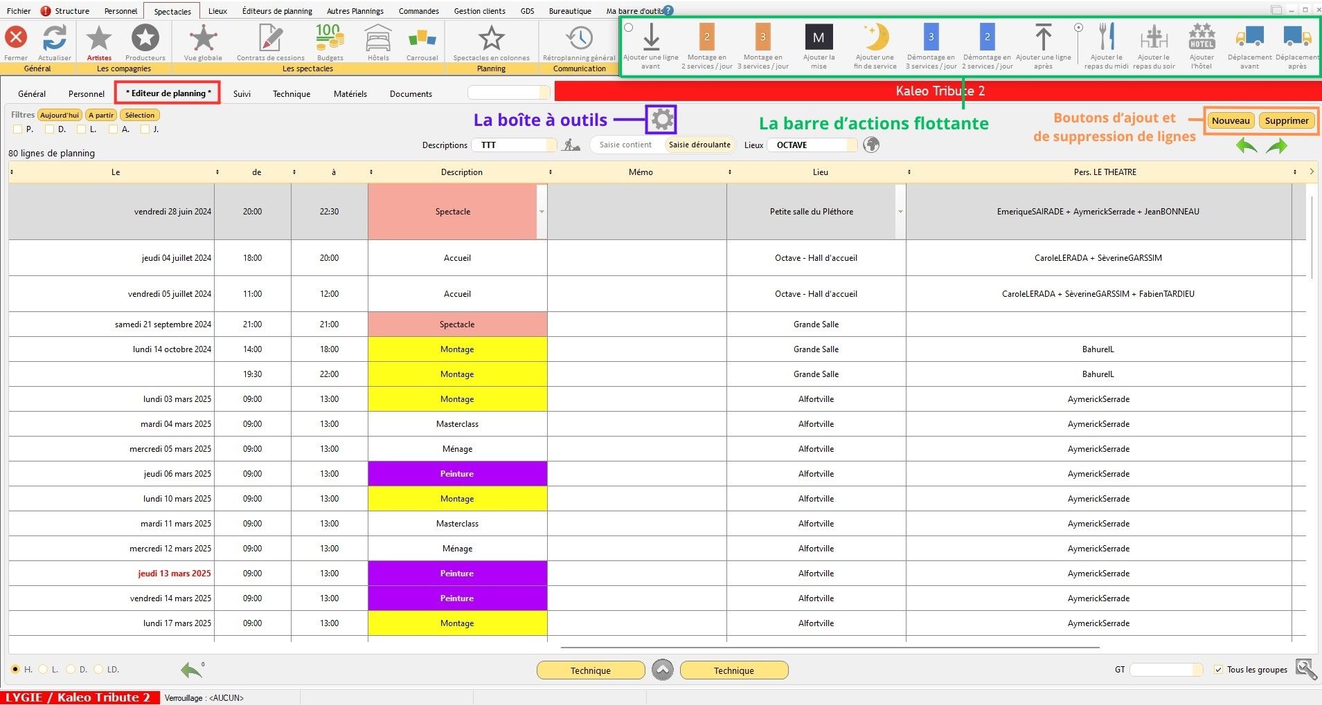 L'onglet "Éditeur de planning" est la source du logiciel. Chacune des lignes et des données inscrites dans cet éditeur sera utilisé par les différents outils Régie Spectacle