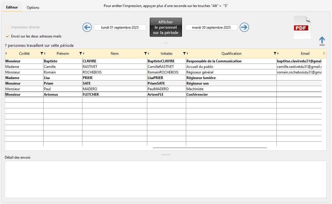 2/ Dans l'onglet "Éditeur" de l'Impression des Plannings du Personnel", cochez l'option en haut à gauche "Envoi sur les deux adresses mails"