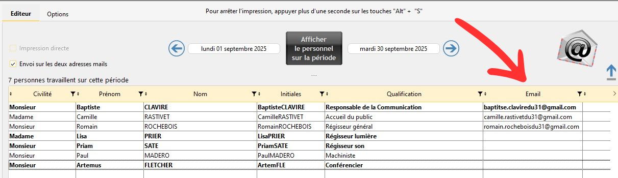 Une colonne affiche les adresses emails du personnel planifié dans l'onglet "Éditeur". Cela permet de vérifier s'il y a bien une adresse email avant d'envoyer tous les plannings.