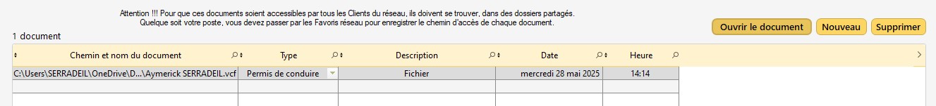 La fenêtre des documents de la personne s'ouvre pour pouvoir les gérer (Ouvrir/Nouveau document/Supprimer).