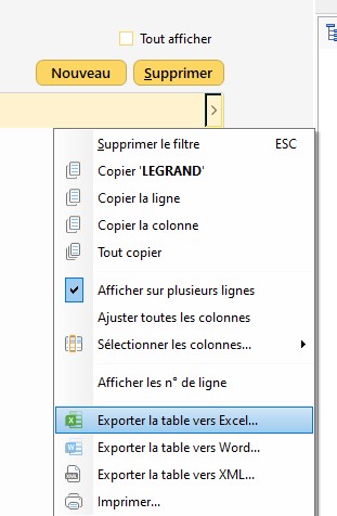 Exporter la table sur un tableur :