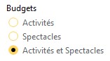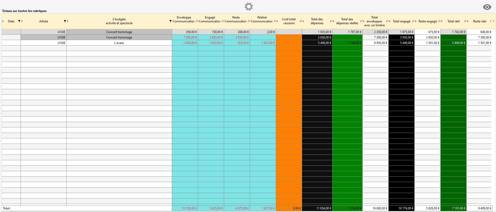 est une table générale regroupant tous les budgets des évènements/activités de la structure. Il est possible d'accéder depuis cette fenêtre à la fiche d'un évènement/activité ou à sa fiche "Budget spectacle".