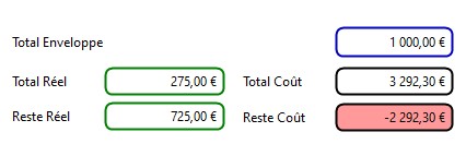 L'Enveloppe période est saisie automatiquement. Elle est retrouvée grâce à la date de début du filtre période. Une alerte non bloquante indique si les dates de début et de fin ne sont pas identiques. Sous la table générale, on retrouve un récapitulatif des données : les champs noirs sont relatifs à l'enveloppe et la période concernées. Les champs verts sont relatifs au réel