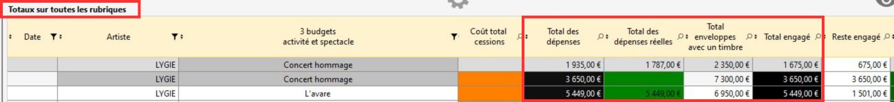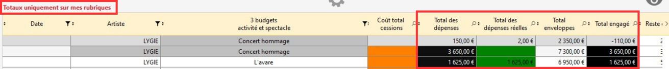 Dans la version 3 (nouvelle version) des budgets, les utilisateurs, suivant leurs droits utilisateurs, peuvent n'avoir accès qu'à certaines rubriques générales du budget. Par défaut, le budget des spectacles va leur afficher dans les colonnes portant la mention "Total", les données totales de toutes les rubriques, même celles auxquelles ils n'ont pas accès. La mention "Totaux sur toutes les rubriques", en haut à gauche de la table fait part de cette information.