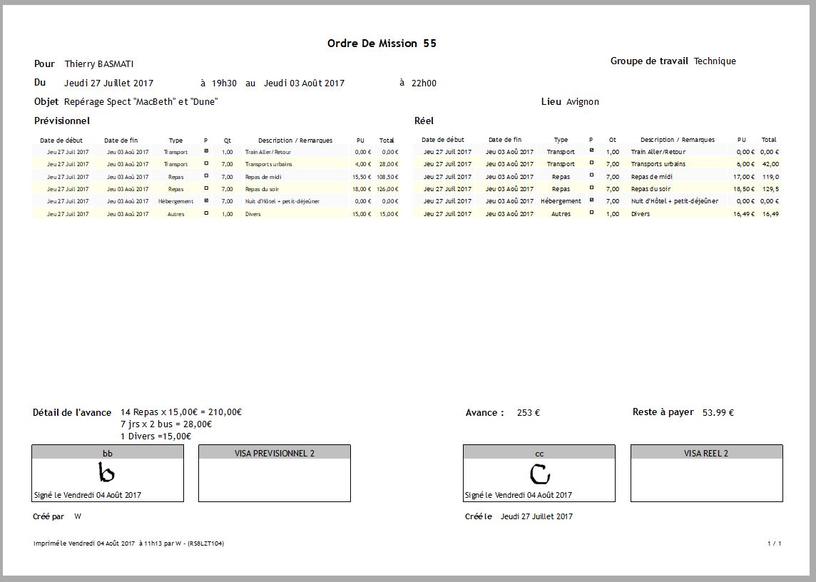 - Les signataires et les dates de signature : jusqu'à 2 utilisateurs peuvent signer le prévisionnel de l'Ordre de mission.
