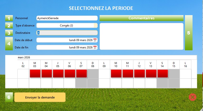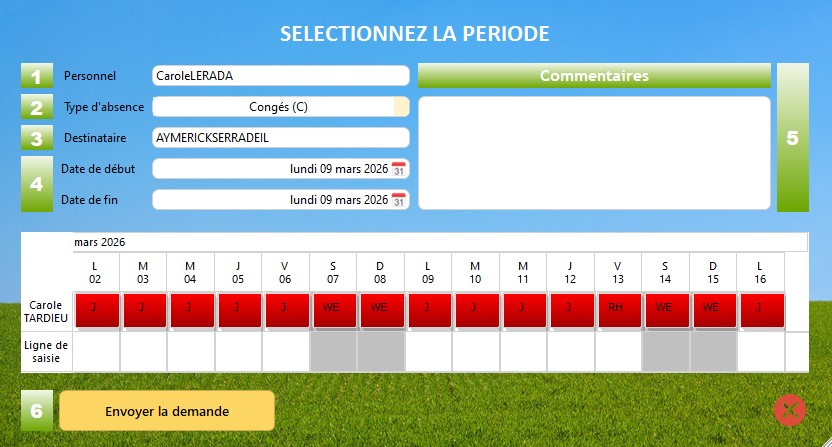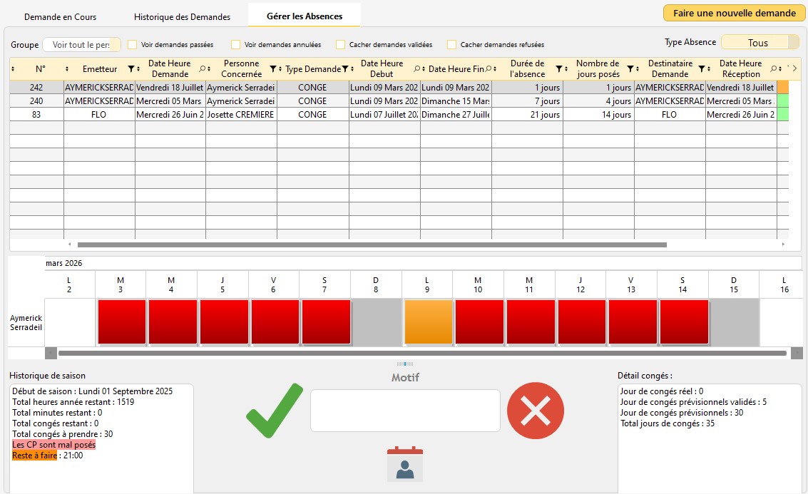 permet de gérer les demandes d'absence et de congés du personnel de la structure : l'utilisateur fait une demande pour lui ou un autre salarié, le responsable accepte ou refuse cette demande. Si la demande est acceptée, le planning de la personne concernée est modifié en conséquence. Les utilisateurs sont avertis de la demande ou de la réponse par un message généré automatiquement (voir le chapitre "Messagerie interne").