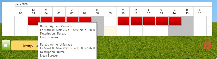 Le survol d'une case rouge dans le planning de la personne permet d'afficher le détail de son planning.