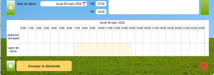 Selon le type d'absence et le salarié choisi, la barre de saisie s'actualisera et permettra de voir son planning. Sélectionnez dans la ligne de saisie les heures ou jours demandées.