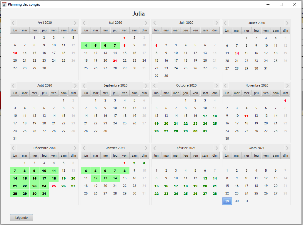 Les jours de congés prévisionnels posés par la personne apparaissent en noir surlignés en vert.