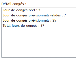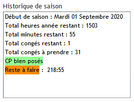Sous le bandeau des jours posés, deux cartouches vous informent sur l’Historique de saison de la personne et le Détail de jours de congés.
