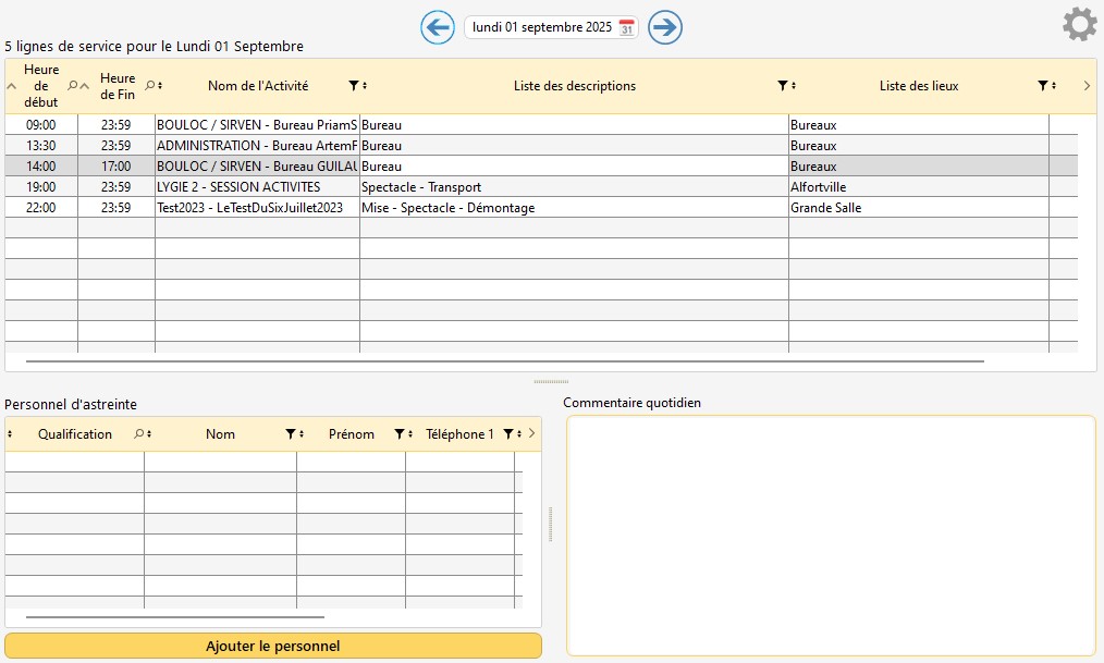 La table en bas à gauche affiche la liste du personnel d'astreinte.