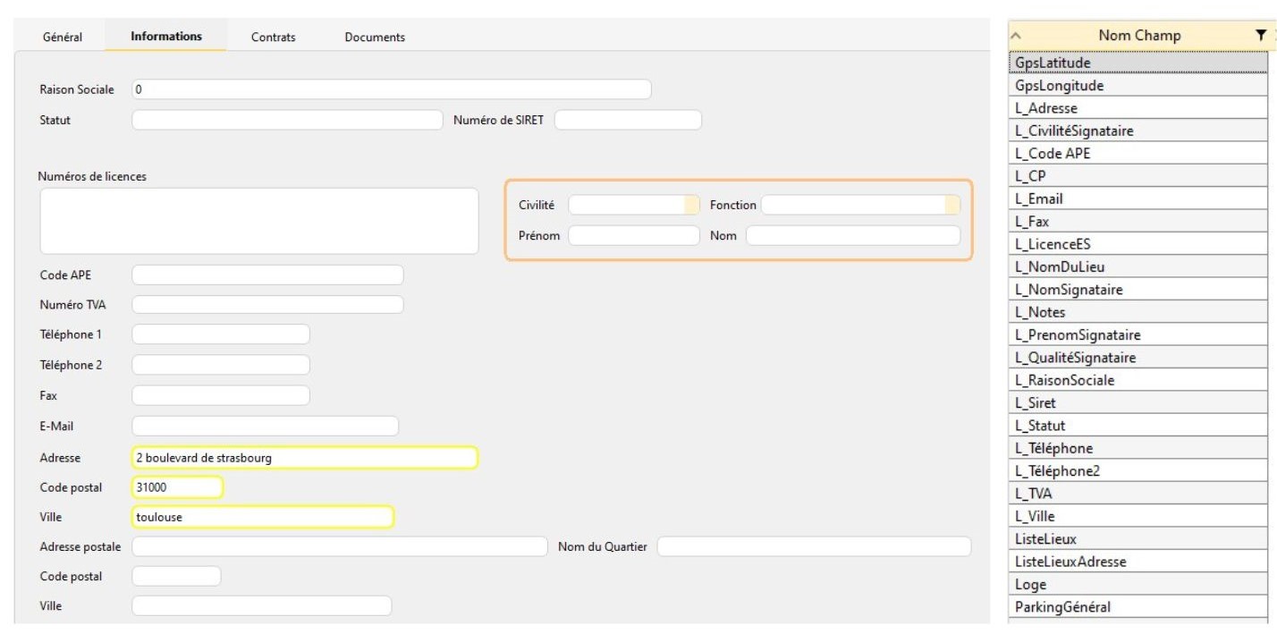 Les informations contenues dans les onglets permettent de gérer les contrats de cession et les documents liés aux lieux. Tous les champs de l'onglet « Informations » sont disponibles dans les modèles de contrats et documents.