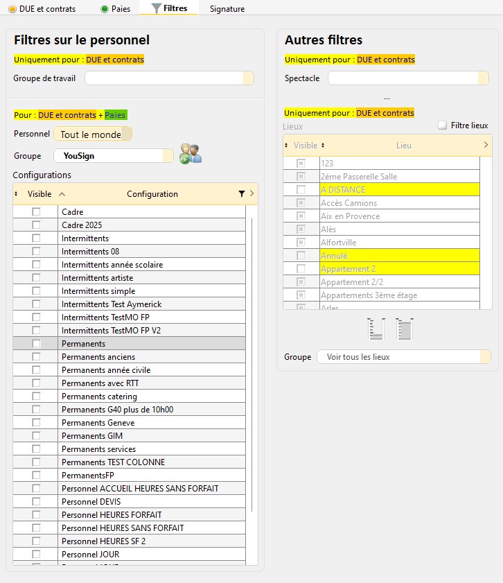 L'onglet "Filtres" permet d'affiner davantage la recherche, en complément des filtres simples présents sur les fenêtres "DUE et contrats" et "Paies".