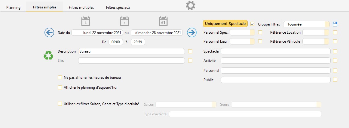 L'onglet "Filtres Simples" regroupe toute une série de filtres qui vous permettent d'effectuer une sélection simple dans le planning général. Par exemple, filtrer le planning d'un spectacle en ne prenant en compte que ce qui concerne le personnel du spectacle ou filtrer le planning d'un lieu en ne prenant en compte que les représentations (Spectacle).
