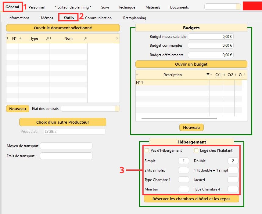 1/ Dans la fiche d'un spectacle/activité, dans l'onglet "Général" et le sous-onglet "Outils", renseignez le nombre de lits et de chambres nécessaires dans les différents champs se situant dans l'encart vert "Hébergement".
