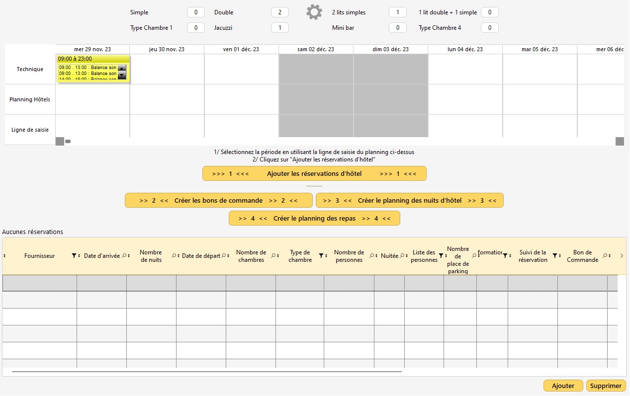 1 - Ajouter les réservations d'hôtel : permet de renseigner les lignes de réservation d'hébergement pour les artistes et les compagnies.