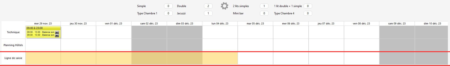 1/ Dans la table du haut, dans la ligne "Ligne de saisie", sélectionnez les jours qui concernent votre réservation.
