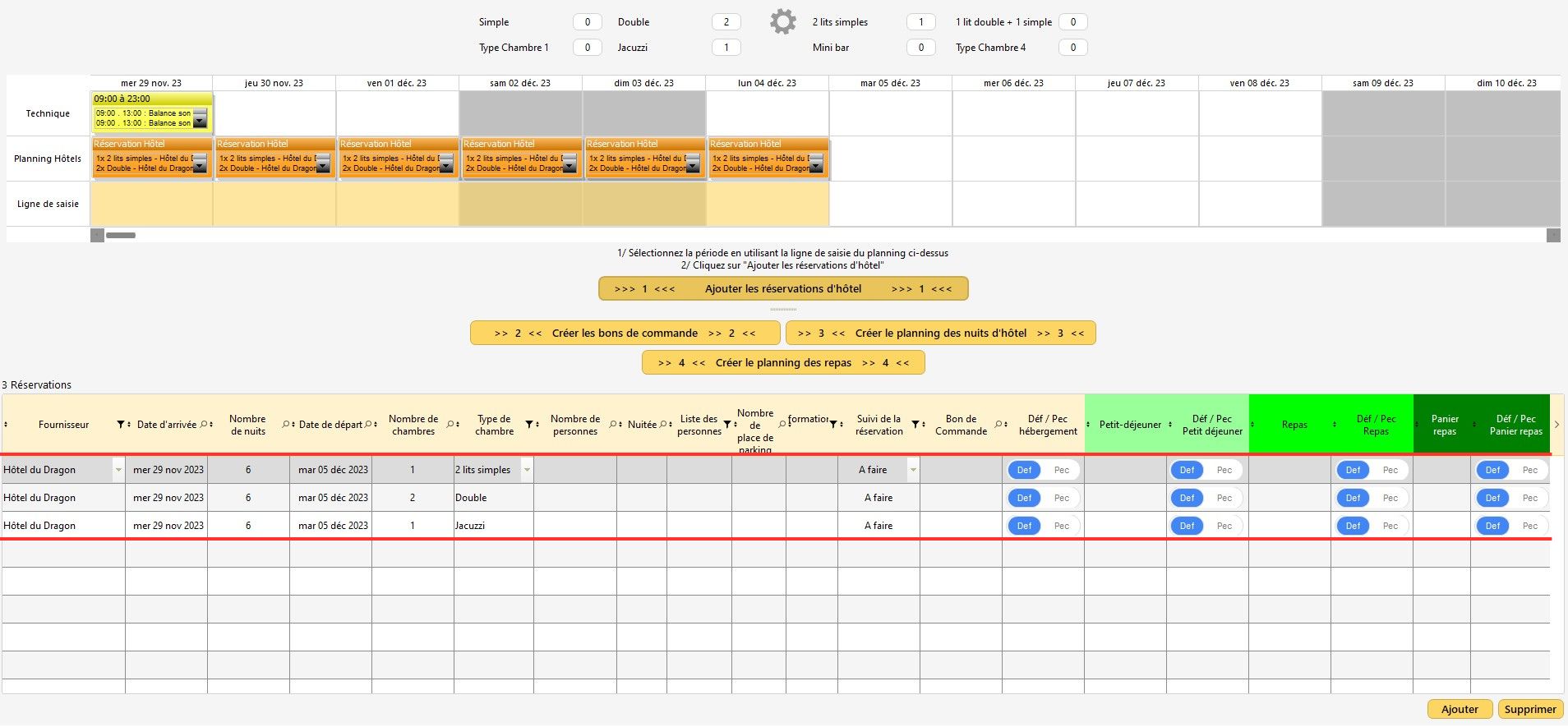 4 - Créer le planning des repas : permet de créer rapidement des lignes de planning avec la description "Repas", en lien avec les lignes de réservation renseignées par l'utilisateur.