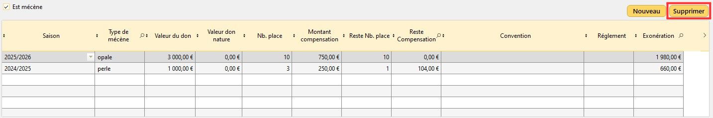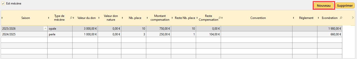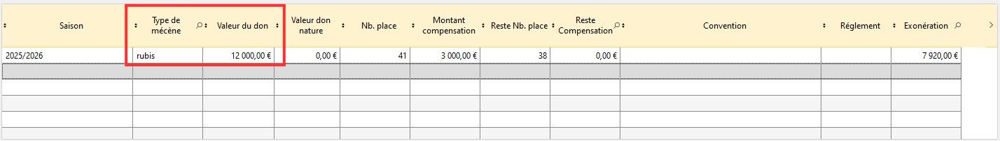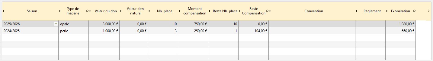 La table située en dessous de la coche sert à renseigner l'ensemble des dons effectués par le mécène à la structure.