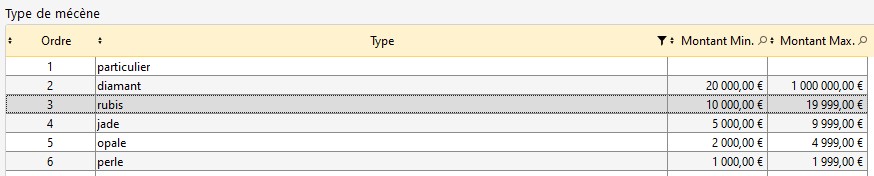 Dans les Menus déroulants, j'ai renseigné que lorsqu'un mécène ferait un don entre 10 000,00 euros et 19 999,00 euros, il serait considéré comme un type de mécène "rubis".