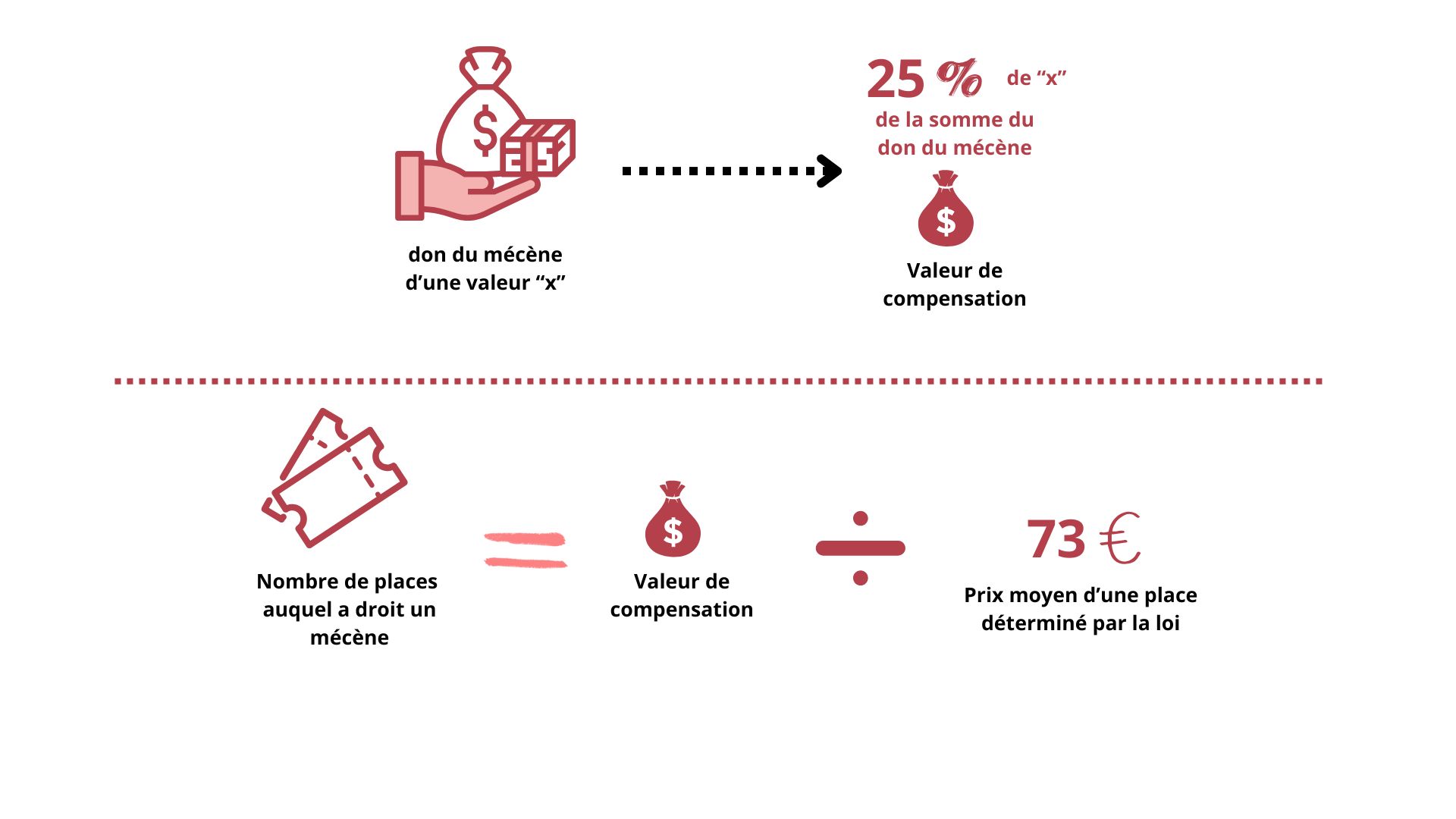 Info : Pour connaître la valeur totale du don, RégieSpectacle fera la somme des données renseignées sur une même ligne dans la colonne "Valeur du don" et "Valeur don nature". La valeur totale du don va déterminer automatiquement le montant de la compensation. Ce dernier montant permettra de calculer automatiquement le nombre de places auxquelles ont droit les mécènes suivant la valeur de leurs dons.