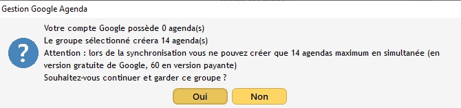 Info : la version gratuite du Google Agenda permet une synchronisation maximale de 14 agendas. Pour fonctionner, votre groupe doit donc contenir 14 éléments maximum. Au-delà, l’export sera incomplet et un avertissement s’affichera (la version payante de Google accorde actuellement 60 agendas).