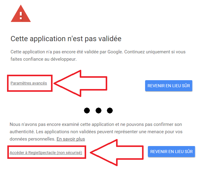 6/ Une fenêtre de sécurité apparaît : confirmer votre confiance dans RégieSpectacle en cliquant sur « Paramètres avancés » puis « Accéder à RégieSpectacle ».