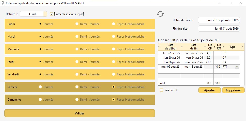 Maintenant que le planning prévisionnel est créé, il faut poser les jours de RTT et modifier le planning prévisionnel depuis la fenêtre de validation.