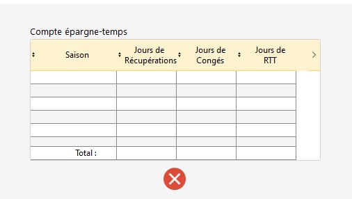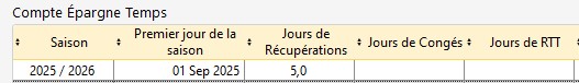 Dans la grille-cadre, il est possible d'utiliser son compte épargne temps en sélectionnant la description "Journée compte épargne temps". Le logiciel va se référer au compteur "Compte Épargne Temps" renseigné dans la fiche de la personne (onglet "Informations 2/2") et décomptera :