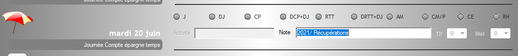 Dans le champ "Note", l'année et le type de journée prise (Récupération / RTT / Congés) sont renseignés. Dans l'onglet "Informations 2/2", la table Compte Épargne Temps est mise à jour.