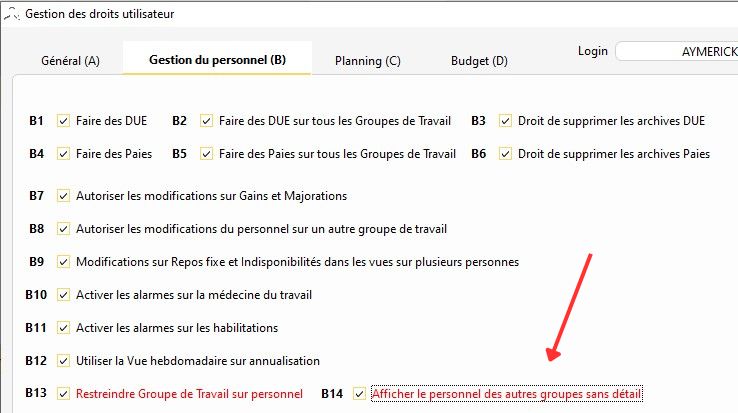 2) Dans la gestion des droits utilisateurs, dans l'onglet "Gestion du personnel", une fois le bouton B13 coché "Restreindre Groupe de Travail sur personnel", un deuxième bouton est à cocher B14 "Afficher le personnel des autres groupes sans détail". Ce droit est dépendant de l'autre et permet d'afficher la liste de tout le personnel.