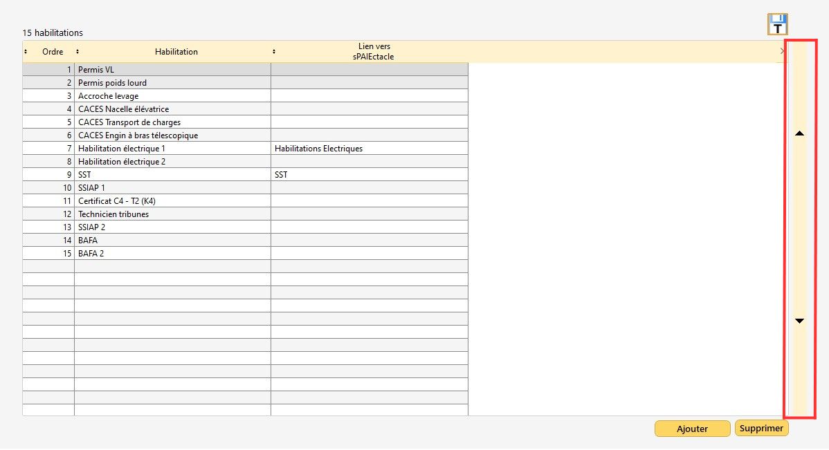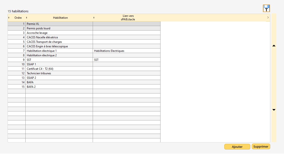 La Colonne "Lien vers sPAIEctacle" permet d'indiquer la terminologie utilisée dans sPAIEctacle pour chaque habilitation. (Essentiel pour l'import / export des personnels).
