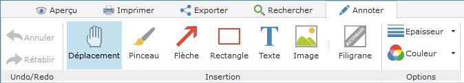 L'onglet propose tous les outils tels que la flèche, l'insertion d'une image ou le filigrane, ...