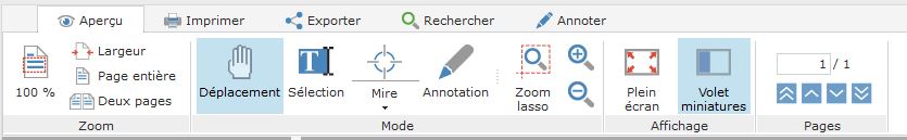 On retrouve ici tous les outils de visualisation : zoom, plein écran, etc., et des fonctionnalités telles que la vue "Deux pages" ou encore la mire.
